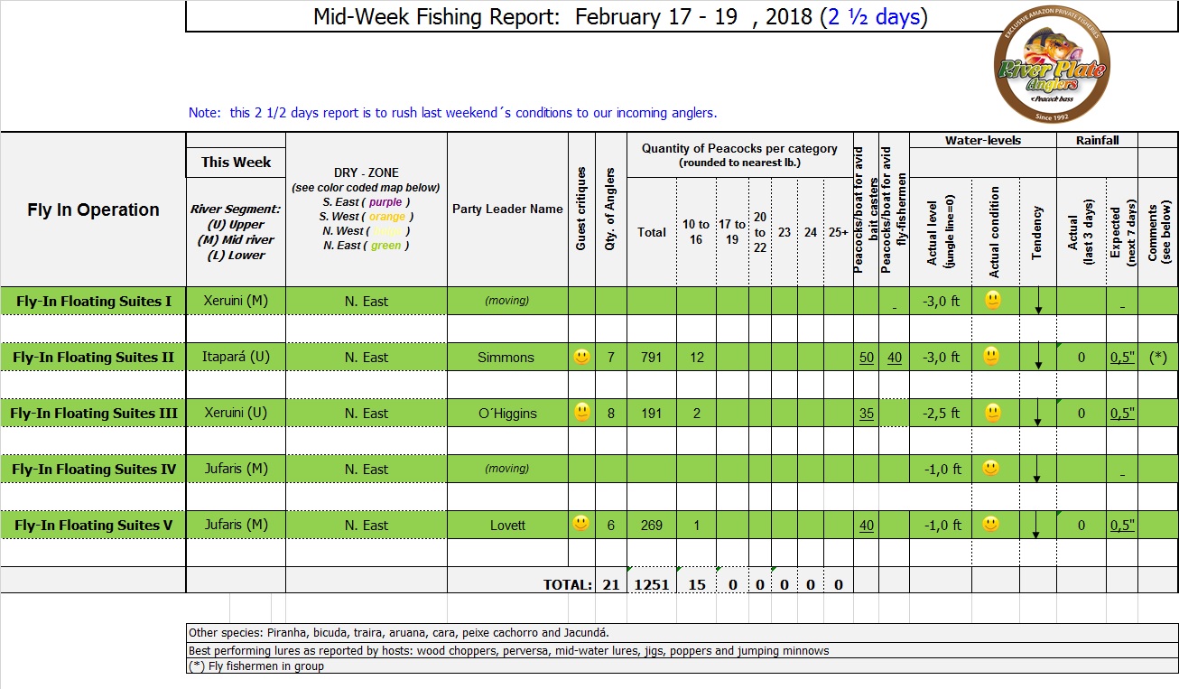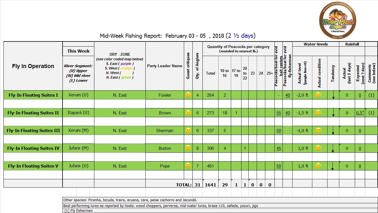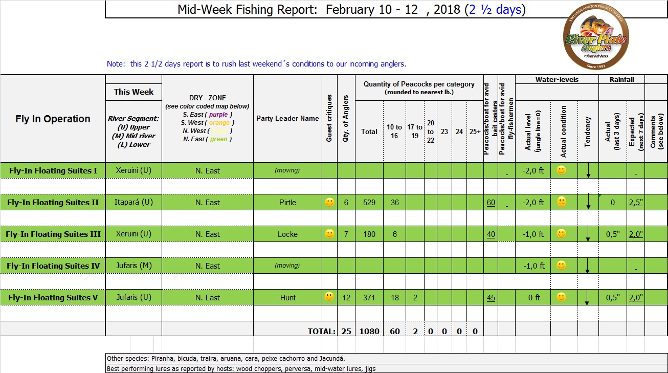 The Branco basin is in its normal receding cycle. Fishing conditions continue to be good in all our fisheries. Negligible rain during the weekend and heavy rain is expected on Friday, Saturday.