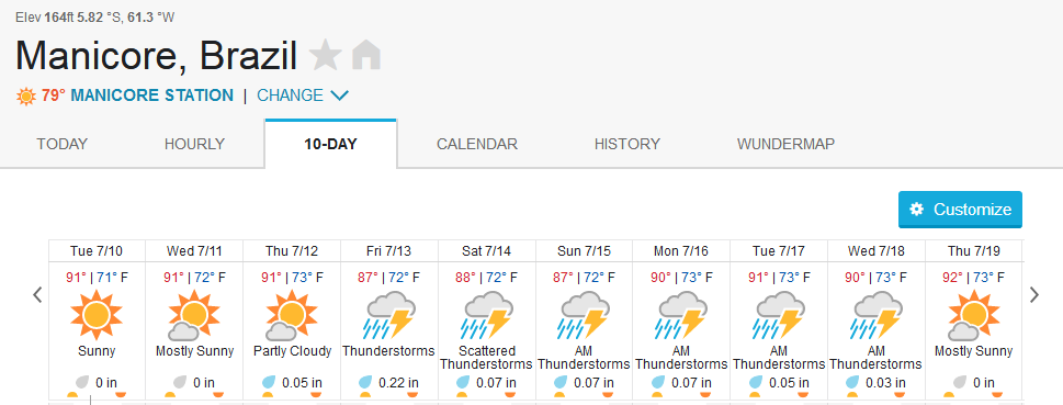 Water levels are 1.8 ft. above optimal level and dropping (see graph below - Humaita). Weather forecast confirms tendency showing no significant rain episodes (see forecast below - Manicore).