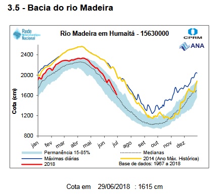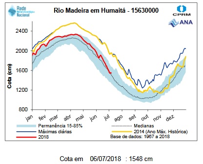 Water levels are 1.75 ft. above optimal level and dropping (see graph below - Humaita). Weather forecast confirms tendency showing no significant rain episodes (see forecast below - Manicore).