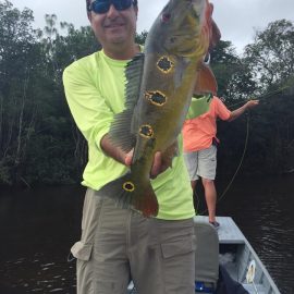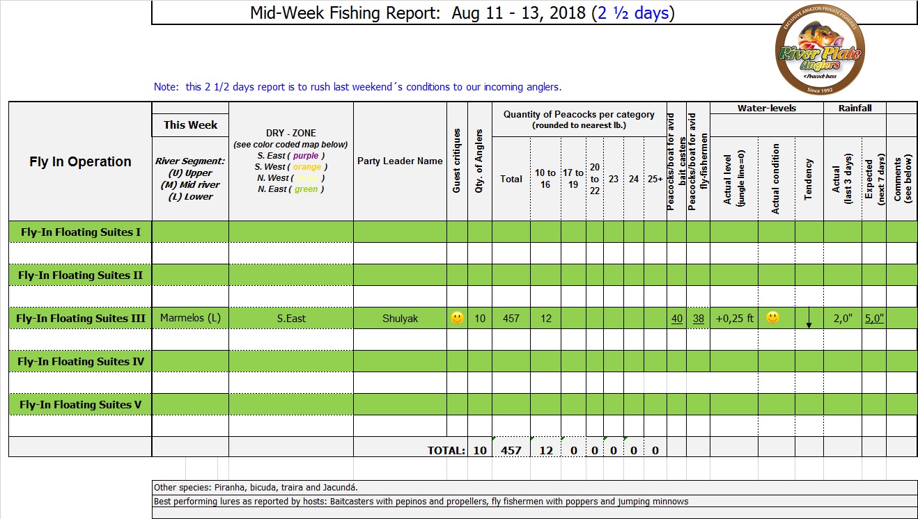 Last Saturday we received the Barrantes mixed group of 8 anglers, fly fishermen and baitcasters. They have endured several heavy rain episodes during the weekend that affected their yields, nevertheless they managed to land a 19lbs trophy that presented quite a fight. Weather is expected to improve significantly for the rest of the week (see forecast below). Last week the Shuliak group ended the week with 1.232 landed peacock bass using mixed fishing styles.