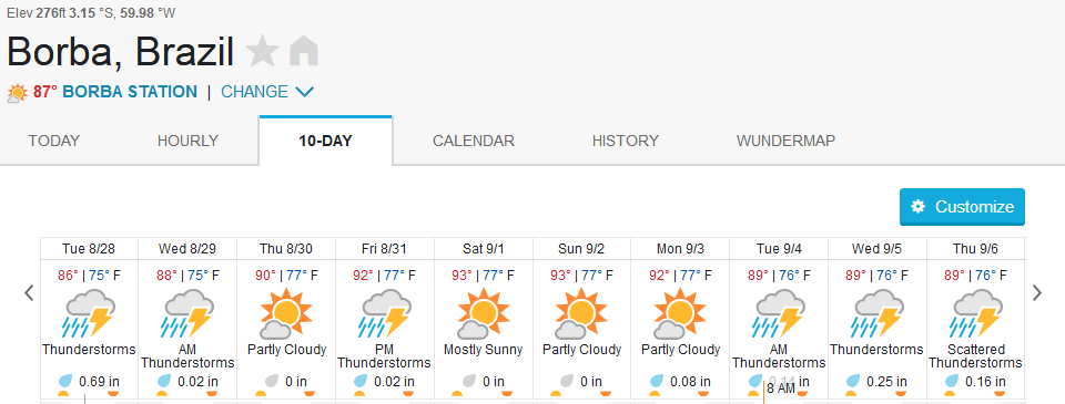 Weather forecast for Borba, in the area of influence of the Matupiri private fishery shows some normal mild tropical storms with no significant rainfall for the rest of the week, supporting the expected water level dropping trend.