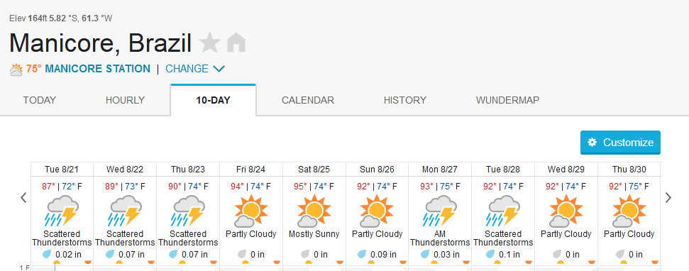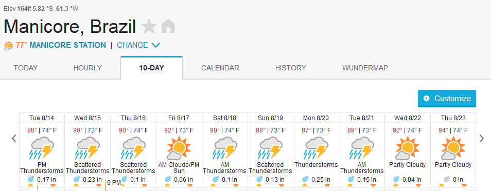 Weather forecast for Manicore , in the area of influence of the Marmelos private fishery shows some normal mild tropical storms with no significant rainfall for the rest of the week.