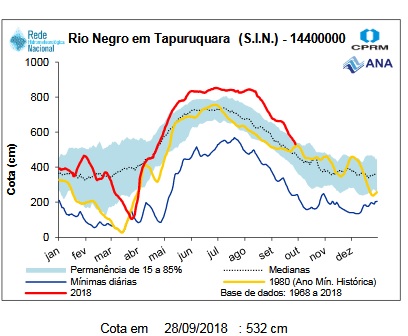 Water levels are high and have already started dropping in the Santa Isabel area (Tapurucuara - see graph below). It is still closed for the season, which is normal for this time of the year. Water level graphs, indicate that most probably this Season we will be having a similar pattern as last year at the Negro and Branco basins.