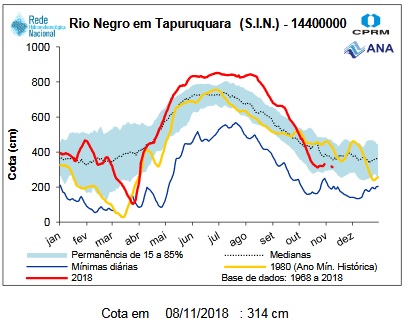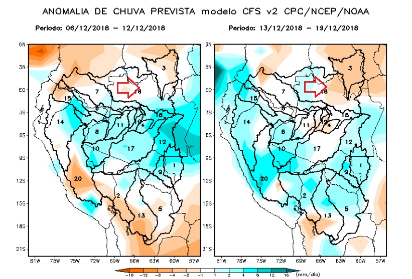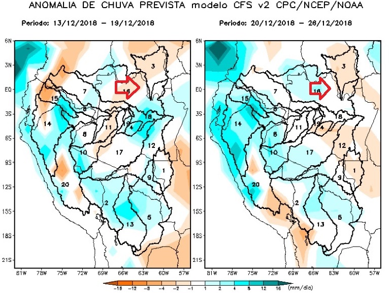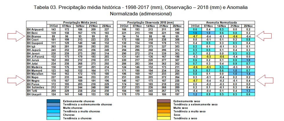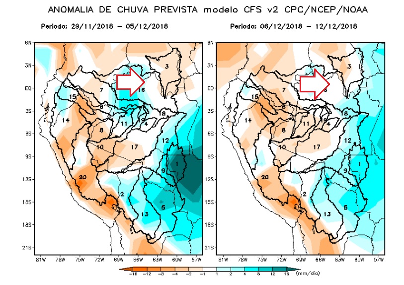 Table below shows the accumulated rainfall, for the Branco and Negro river basins showing no significant anomalies from the norm up to now.