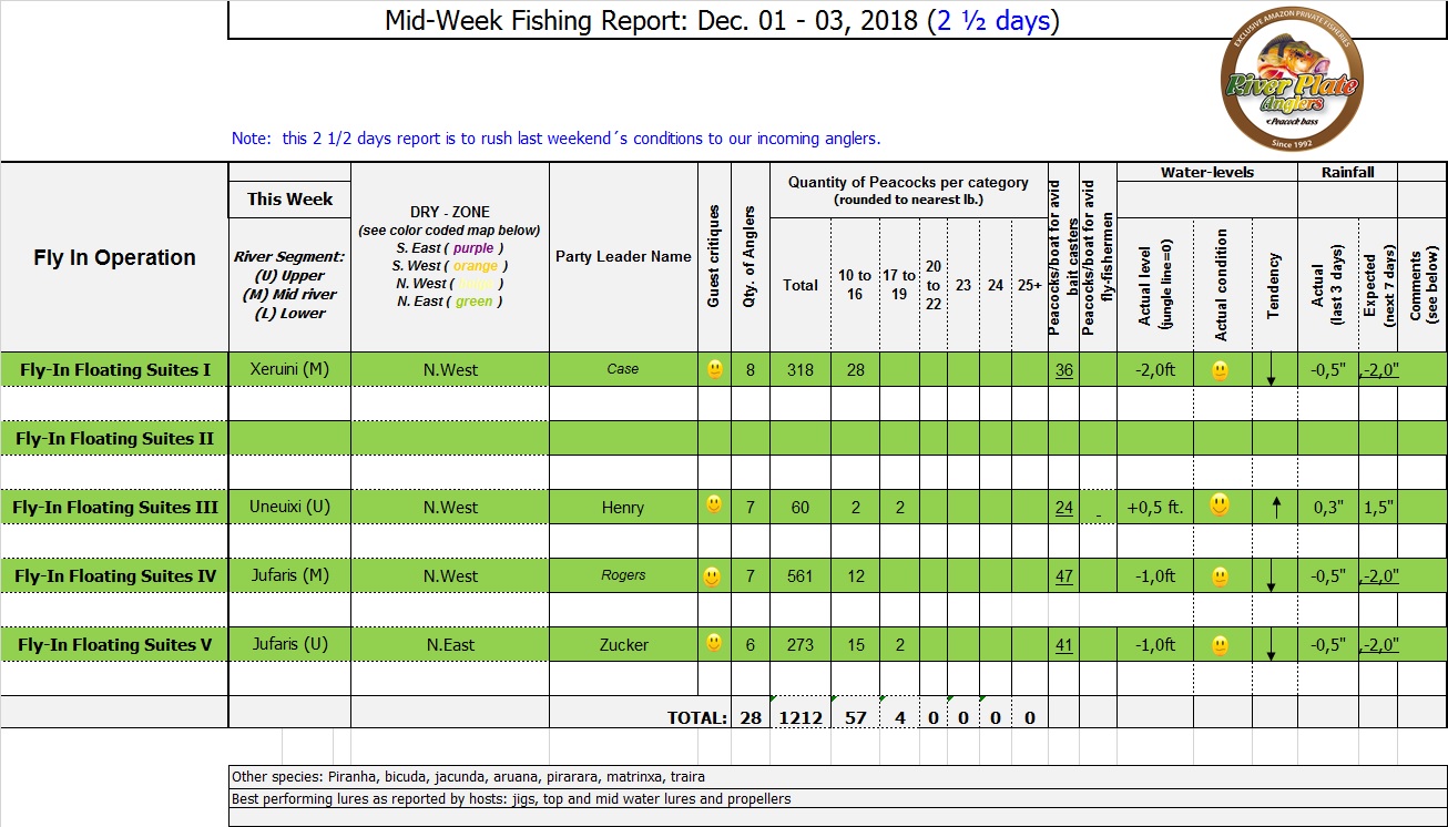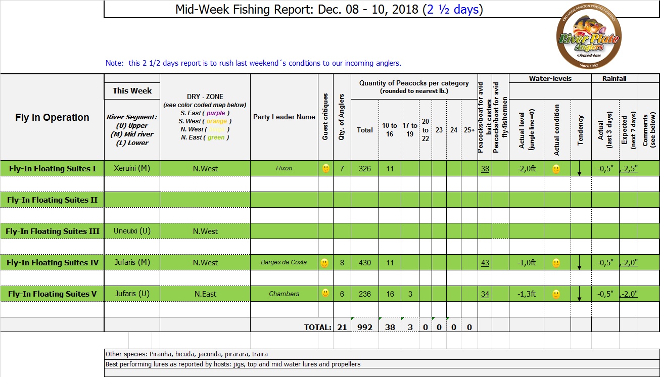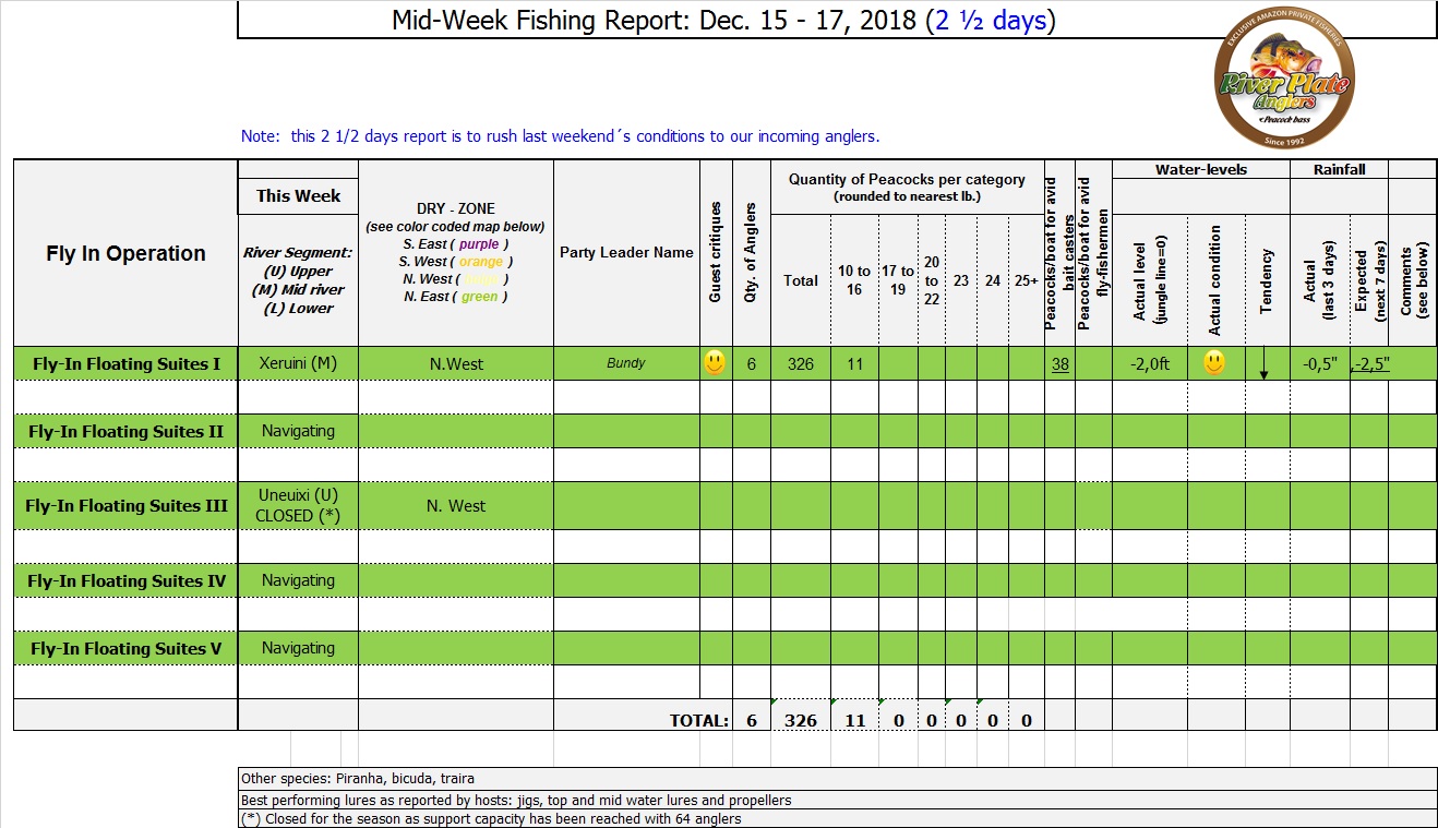 Kabori fishery in Dry-Zone N.West – The Bundy group of 6 anglers arrived on Saturday landing 288 peacock bass in just 2 1/2 days. Largest peacock bass weighed 16lbs. and best performing lures are propellers and top water lures. Last week the Hixon group with some keen fly-fishermen landed over 800 peacock bass the largest of which exceeded the 18lbs. mark. NOTE: The other 4 Floating-Suites camps are navigating to their future destinations after the Christmas recess, at the Jufaris, Itapara, Kabori fisheries, while subject to the programmed mid-season refresh and maintenance process (generators, motors, tackle, linens, etc.).