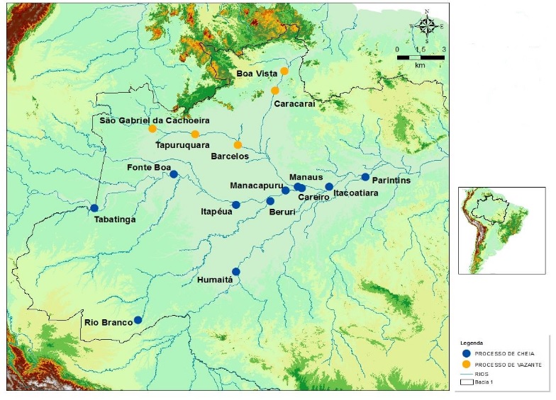 Blue dots represent water level monitoring stations where levels are rising and yellow dots where levels are dropping. Our area of interest is between Barcelos and Caracarai.