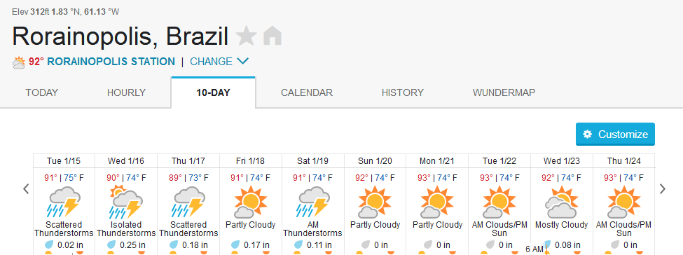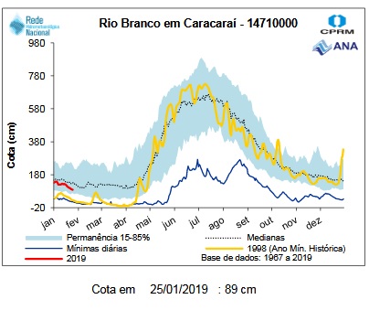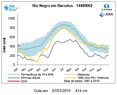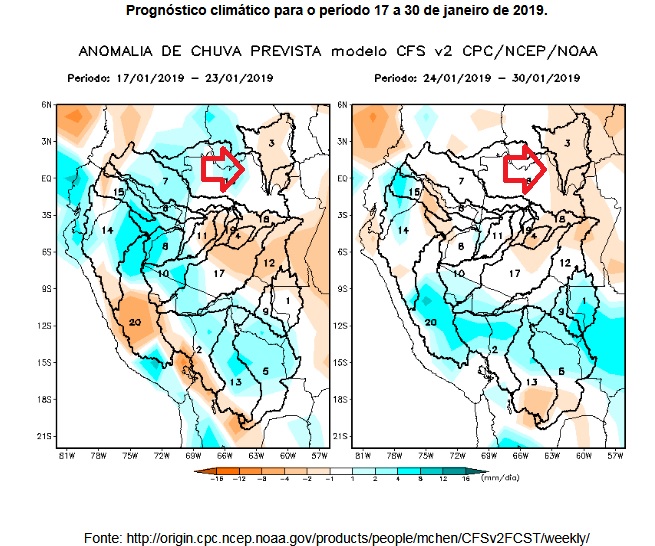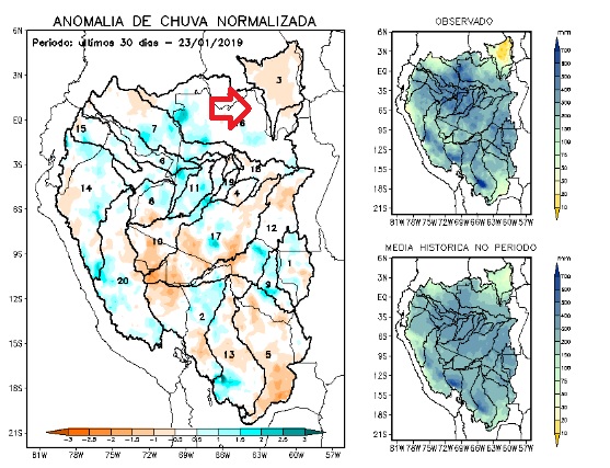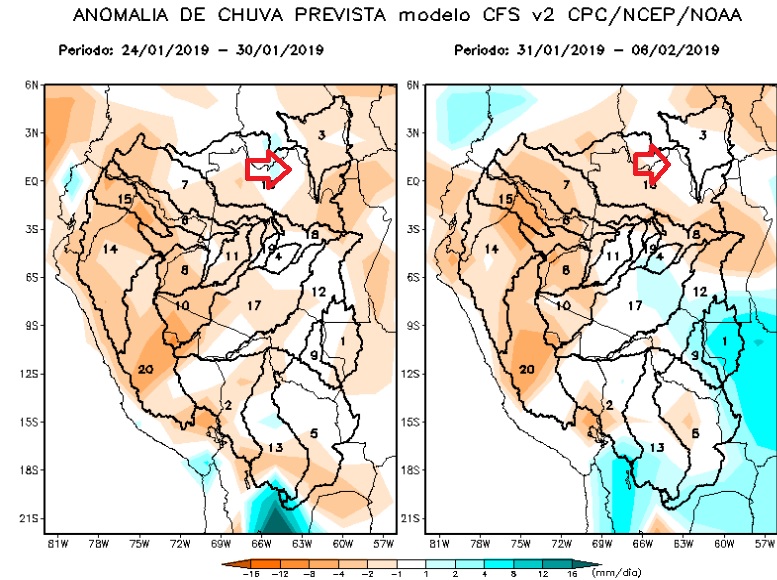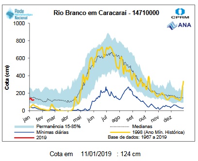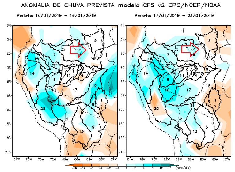 Above the rainfall forecast for Barcelos in the area of influence of the Jufaris and Kabori, below Rorainopolis in the area of influence of the Itapará river, both confirming that the dropping tendency should prevail.