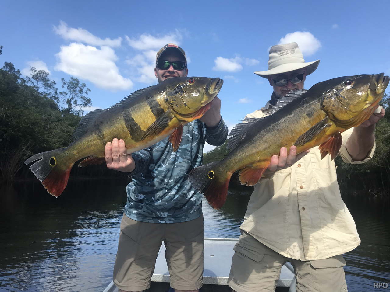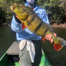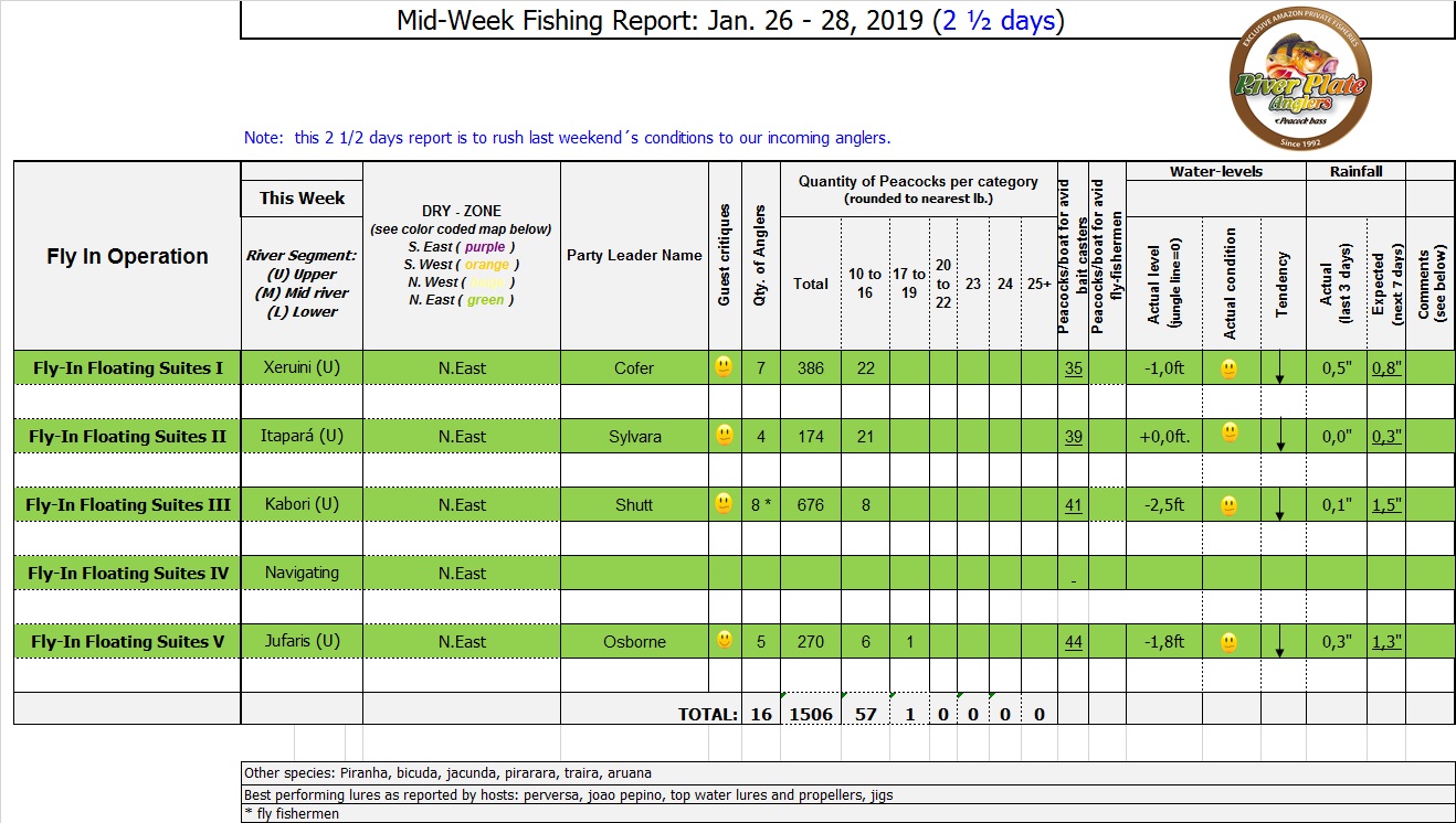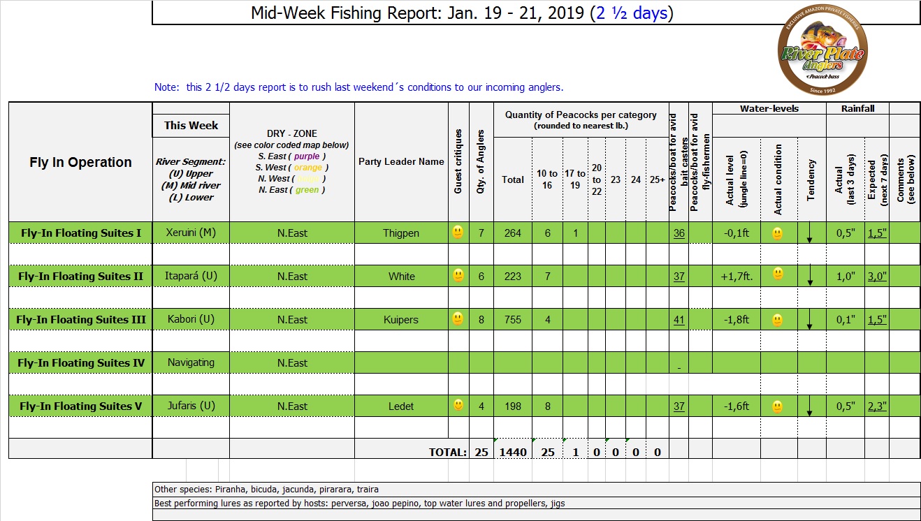 Kabori fishery in Dry-Zone N. East -: The Kuipers group of 8 anglers arrived on Saturday landing 755 peacock bass in just 2 1/2 days. Last weeks final count was 1.968 by the Rankin group. Best performing lures are propellers and top water lures. Water levels are still a bit below the ideal mark but stable, fishing results continue to be solid. Mid -Xeruini fishery in Dry-Zone N. East -: The Thigpen group has landed this year´s benchmark of 19 lbs this weekend. Water levels are very fishable and expected to drop slowly. Itapará river in Dry-Zone N. East – : Received the White group of 6, started the week landing 223 peacock bass. Last week´s final count was 1.450 peacock bass with 5 trophies above the 17lbs mark. Water levels are still a bit above the ideal but they keep dropping, weather forecast supports the tendency. Upper Jufaris in Dry-Zone N.East – : Our single occupancy suites received last Saturday the Ledet group of 4 anglers, under excellent fishing conditions they started with a 198 peacock bass basket with a good size mix. Star lures are perversas and joao pepinos. Good fishing conditions are expected in the coming days.