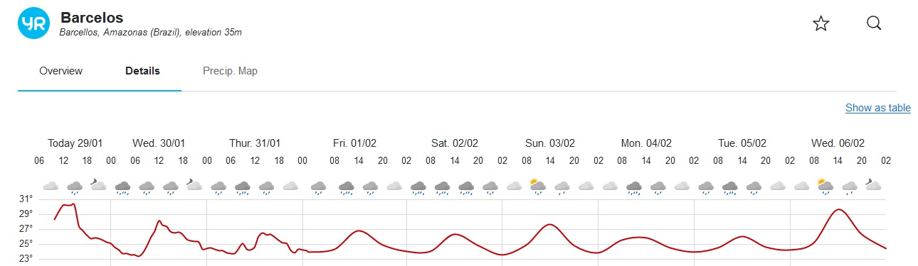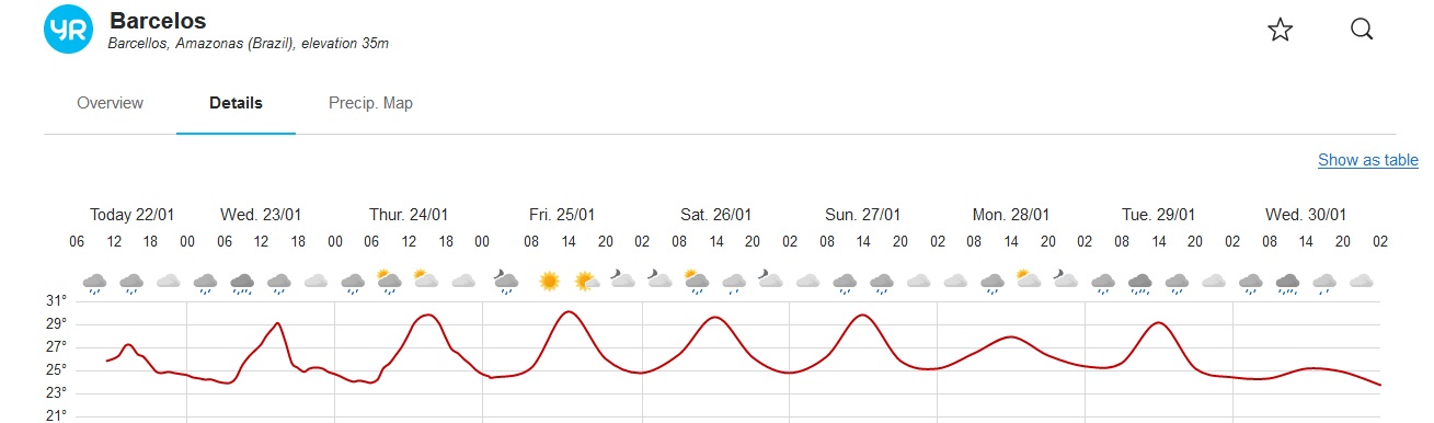 Above the rainfall forecast for Barcelos in the area of influence of the Jufaris and Kabori, below Rorainopolis in the area of influence of the Itapará river, both confirming that the dropping tendency continues in the coming days.