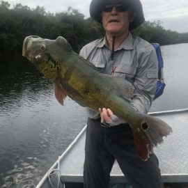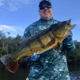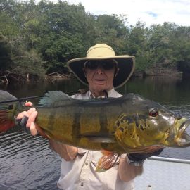 Kabori fishery in Dry-Zone N. East -: The Rankin group of 8 anglers arrived on Saturday landing 566 peacock bass in just 2 1/2 days. Largest peacock bass weighed 17lbs. and best performing lures are propellers and top water lures. Water levels are a bit below the ideal mark but yields are good, levels are dropping very slowly. Mid -Xeruini fishery in Dry-Zone N. East -: The Dean group of 8 anglers landed two trophies above the 17lbs. mark in just 2 1/2 days. Best performing lures are propellers and top water lures. Water levels have stabilized and weather forecast confirms tendency. Itapará river in Dry-Zone N. East – : Received the Kelley group which started the week landing 592 peacock bass largest of which was 18lbs. Water levels are a bit above the ideal and dropping, weather forecast supports the tendency. Upper and Mid Jufaris in Dry-Zone N.East – : Our single occupancy suites received last week the Cox group and they had a great start with several peacock bass above the 10lbs mark. Fishing conditions are excellent and forecast for the coming days is good. Simultaneously the Kring group in the Mid Jufaris are taking a more relaxed approach and enjoying the whole experience taking it more easy. Water levels are a bit on the low side and stable.
