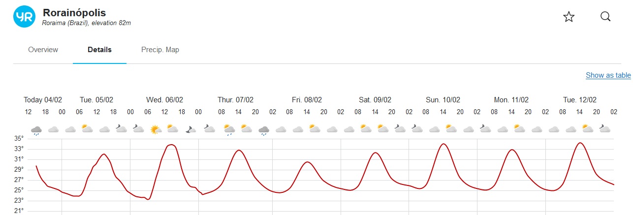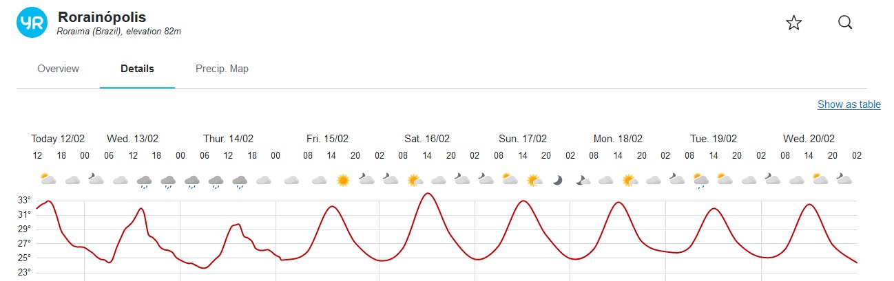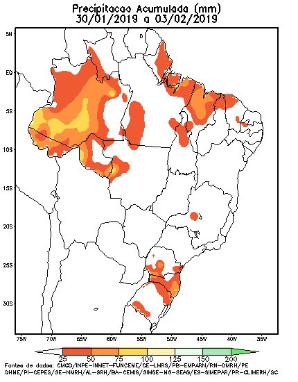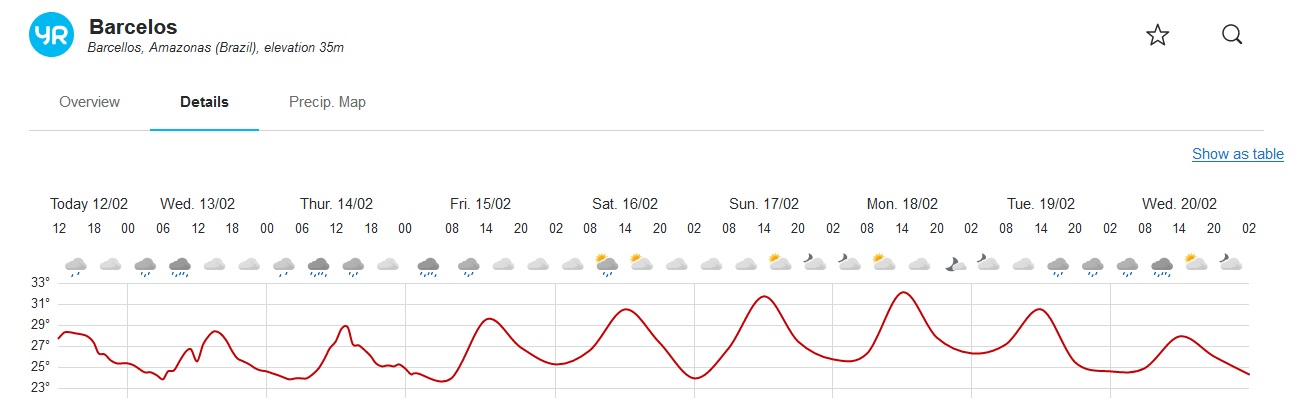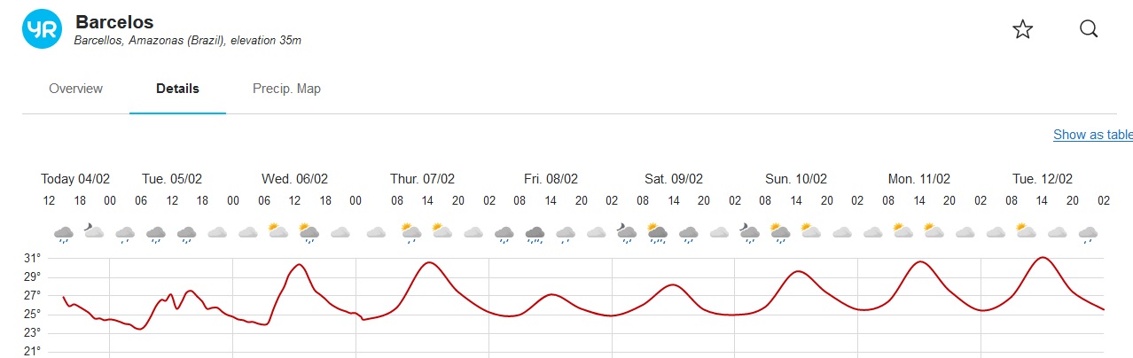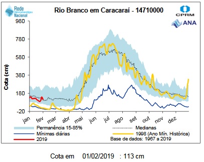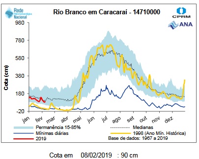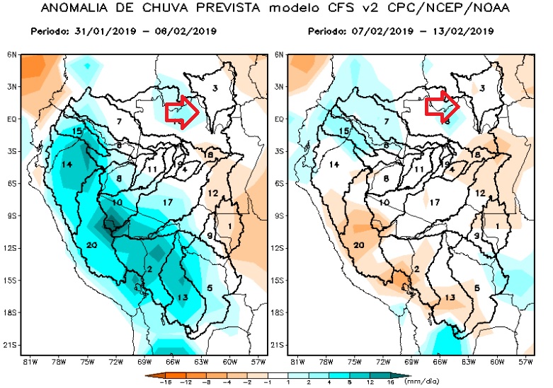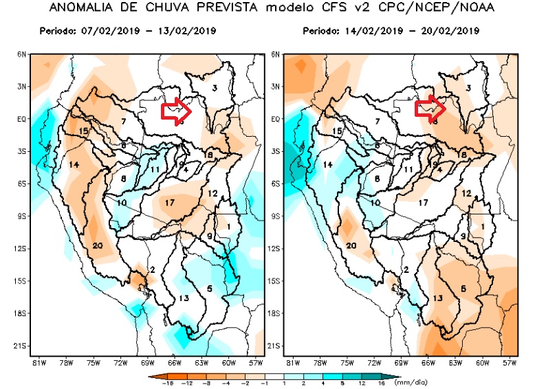 Above the rainfall forecast for Barcelos in the area of influence of the Jufaris and Kabori, below Rorainopolis in the area of influence of the Itapará river, both confirming that the dropping tendency continues in the coming days.