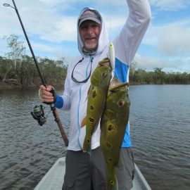 Kabori fishery in Dry-Zone N. East -: Last week the Shutt group finalized with a 1.214 landed peacocks count, largest of which weighed 18lbs. Last Saturday the small and quaint Coser group arrived and in just 2 1/2 days landed 163 peacock bass. Water levels are a bit below the ideal and dropping, fishing conditions are expected to be good in the coming days. Upper -Xeruini fishery in Dry-Zone N. East -: The Miller group had a good start with a nice size mix in the bag. Best working reported lures are perversas, joao pepino, propellers and jigs. Levels are dropping and weather forecast confirms the tendency. Itapará river in Dry-Zone N. East – : Last week just 4 anglers in the Sylvara group landed an outstanding basket of trophies with three 19 pounders, three weighing 18 lbs and four 17lbs, other 88 were above the 8 lbs. mark. Last weekend under heavy rain conditions the Brasher group had a great start with 303 landed peacock bass, largest of which weighed 18 lbs. Upper Jufaris in Dry-Zone N.East – : Our single occupancy suites received last Saturday 7 anglers in the Alaimo group.They started with 226 landed peacock bass, the largest of which weighed over 16lbs. Camp reports that locally tied jigs were still the stars this weekend and they also have some fly fishermen in the group. Good fishing conditions are expected to continue in the coming days.