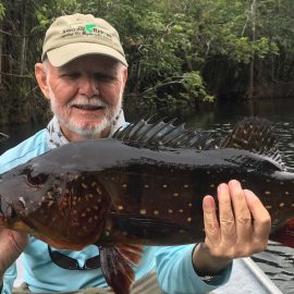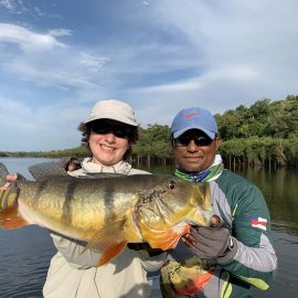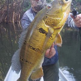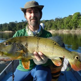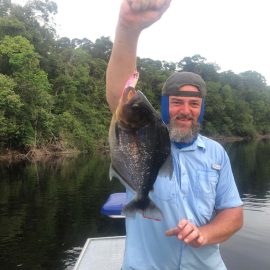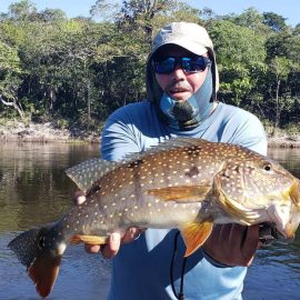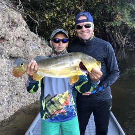 Matupiri fishery in Dry-Zone S. West -: Last Saturday we received the Trask group of 6 anglers in our Floating cabins fishing the mid Matupiri; Stephen Trask and Robert Page are visiting our operations yet one more time, and intend to do some exploratory trips in surrounding rivers. They enjoyed good weather conditions, their fish count was 413 landed peacock bass. Rain forecast is good and dropping tendency is expected to continue. Last week the Bell group anglers landed 1.061 peacock bass in the week largest of which weighed 16lbs. Roçado fishery in Dry-Zone N. West -: This fishery continues in standby status this week. Water levels resumed the dropping tendency, forecast is good and river is under permanent monitoring, it is expected to resume operations in the coming weeks (likely Nov 09). Omero lakes in Dry-Zone N. East -: This weekend we received the Bilberry group of 7 anglers, who enjoyed excellent fishing conditions landing 387 peacock bass in just 2 1/2 days within a mixed bag that included beautiful aruanas, cachorra, piranha, jacunda, cara-açu, traíra, pirara and pirapitinga. Best performing lures are perversas as reported by camp.Last week the Key group had an excellent tally with 1.692 landed peacocks, largest of which weighed 18lbs and within a mixed bag of species including aruanas, pirarucus, etc. Fine weather and good water levels expected in the coming days. Upper Itapará fishery in Dry-Zone N. East -: Breaking water at our traditional fishery in the Upper Itapará, this weekend we received James Cahill III and Tracy Love visiting us once again, who had a challenging start with water levels a bit on the high side, but fishable. Weather conditions will be good for the rest of the week, and fishery is expected to improve conditions in the coming dates, camp will move as far towards the fountain head as the jungle allows them. Upper Jufaris fishery in Dry-Zone N. East -: Breaking water also at fishery in the Upper Jufaris, this weekend we received Eben and Aaron Huston one more time in this fishery, who had a challenging start enduring some heavy rain episodes and with water levels a bit on the high side, but very fishable, landing a couple of trophies, largest of which exceeded the 20lbs mark.. Weather conditions will be good for the rest of the week, and water levels are expected to keep dropping tendency.