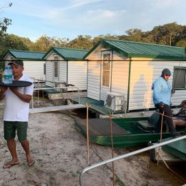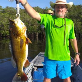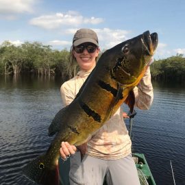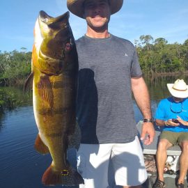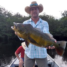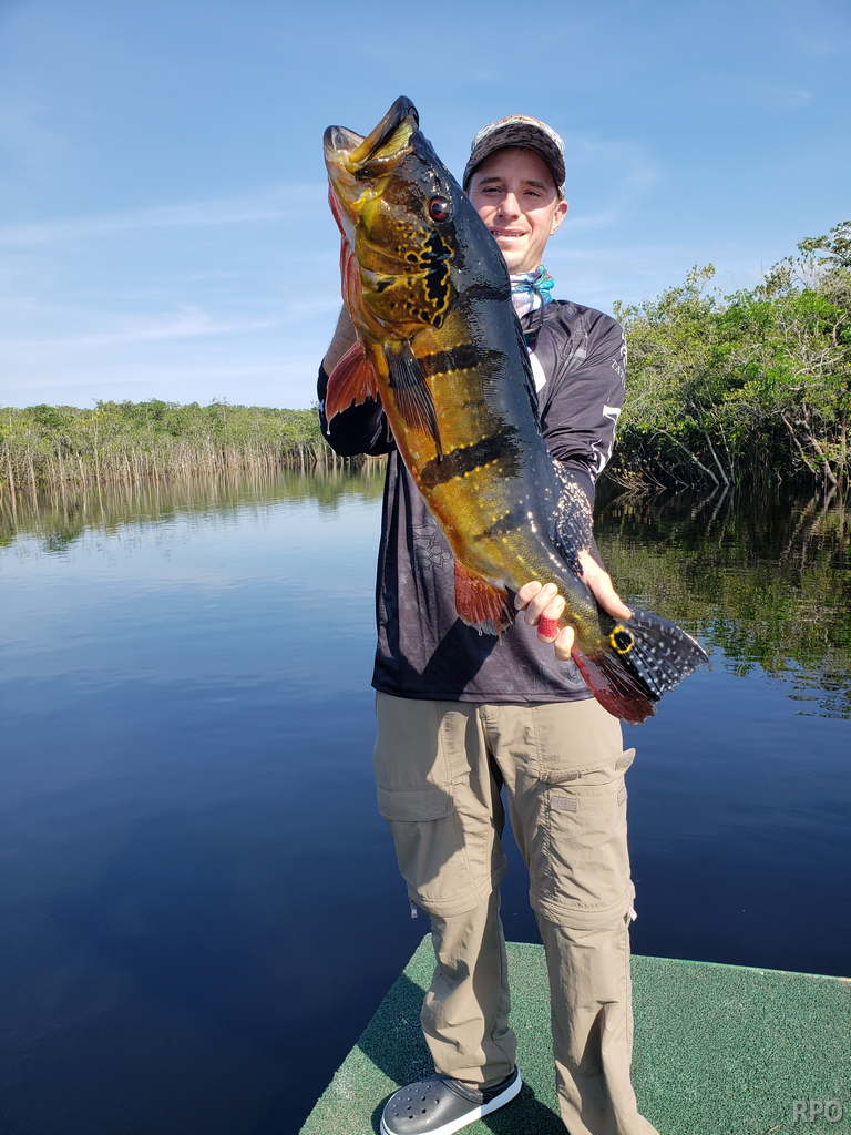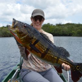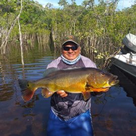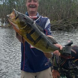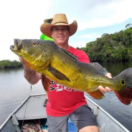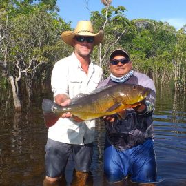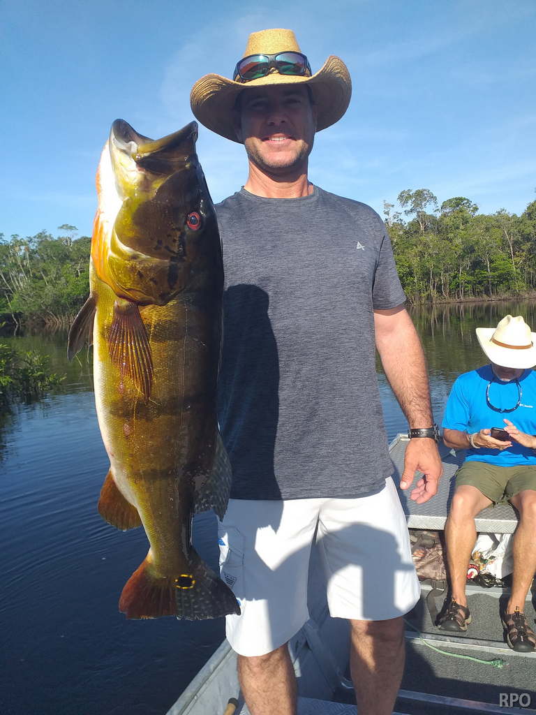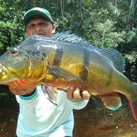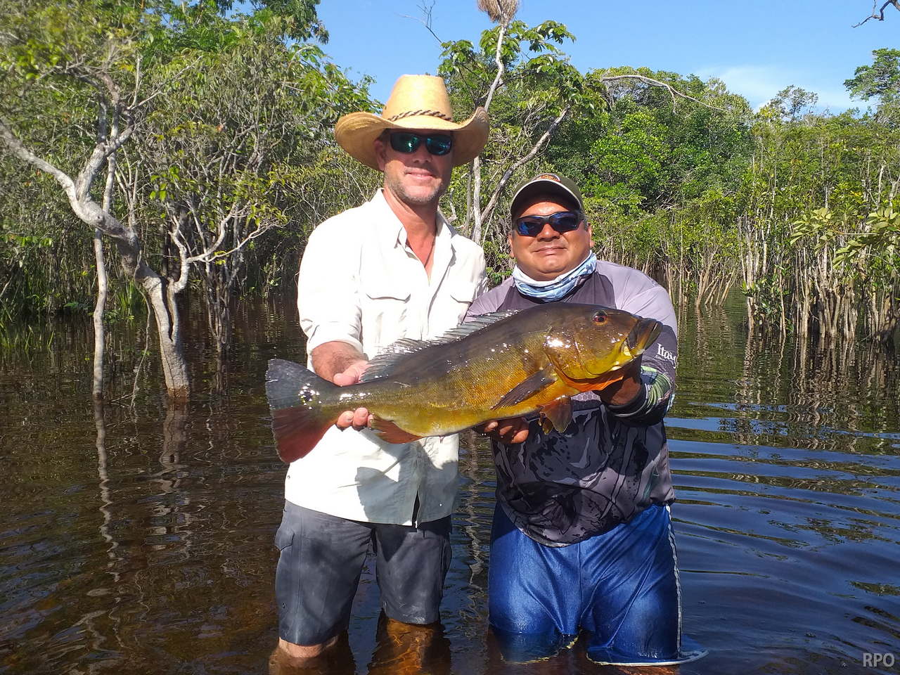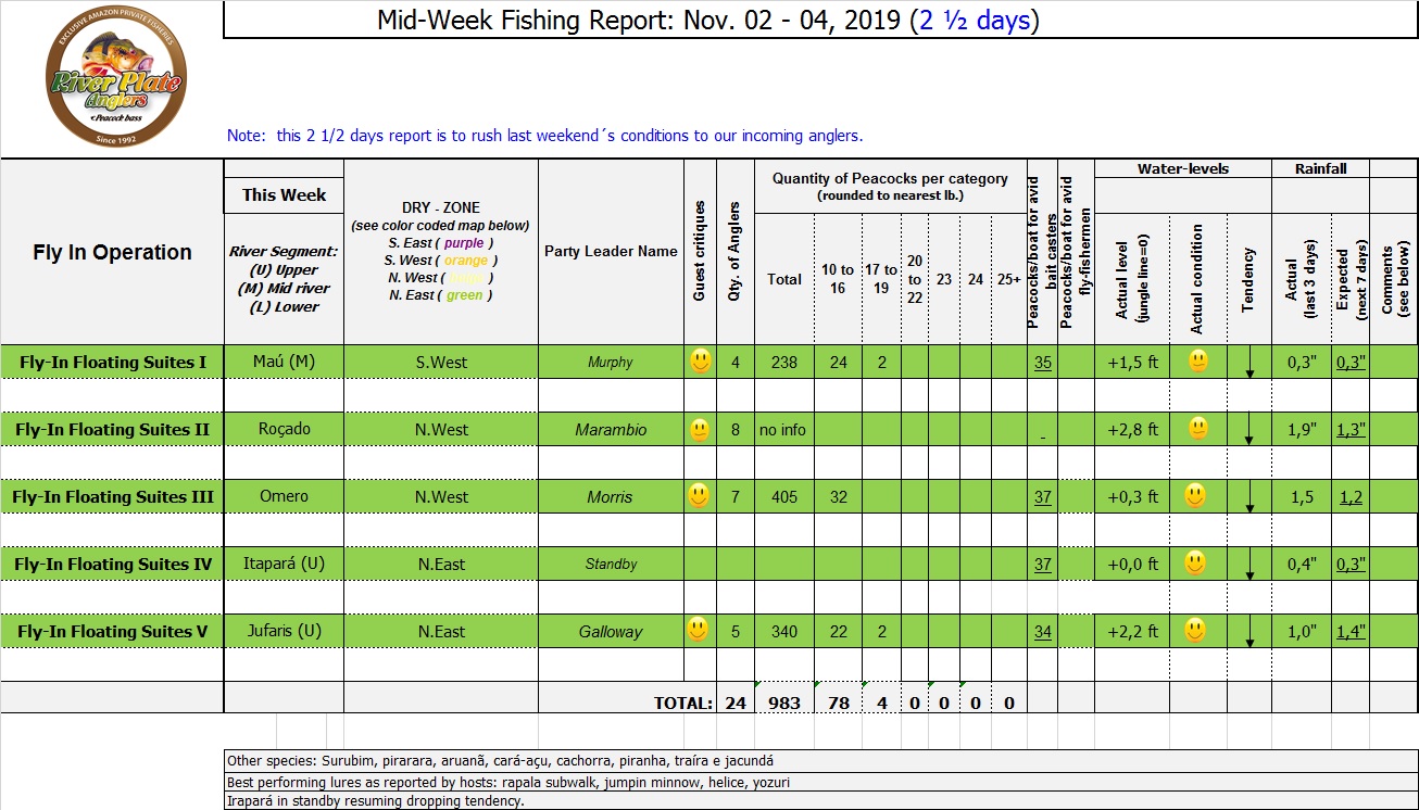Omero lakes in Dry-Zone N. East -: This weekend we received the Morris group of 7 anglers, who enjoyed excellent fishing conditions landing 405 peacock bass in just 2 1/2 days within a mixed bag that included Surubim, pirarara, aruanã, cará-açu, cachorra, piranha, traíra e jacundá. Last week the Bilberry group had an excellent tally with 1.052 landed peacocks, largest of which weighed 18lbs and within a mixed bag of species including Pirarucu, Pirarara, Aruanã, Cara-açu, Tambaqui, Cachorra, Traíra, Jacundá, e Pirapitinga etc. Fine weather and good water levels expected in the coming days. Maú river fishery in Dry-Zone N. East -: Breaking water at our Maú river fishery , this weekend we received the Murphy group of 4 anglers, who had a good start with water levels a bit on the high side, but very fishable. Weather conditions will be good for the rest of the week, and fishery is expected to improve conditions in the coming days. Upper Jufaris fishery in Dry-Zone N. East -: This weekend we received Galloway group of 5 anglers, who had a good start landing 340 peacock bass the largest of which weighed 19lbs. Weather conditions will be good for the rest of the week, and water levels are expected to keep dropping tendency, camp reports that propellers, jumpin minnows, yozuri and rapala subwalk are the best performing lures this week. Roçado fishery in Dry-Zone N. West -: Although this fishery is not at its optimum, and the not so good weather forecast, the Marambio group insisted in braving the adverse conditions this week and making the most of it. Fishery is expected to improve conditions in the coming days. We have no data of this camp since communications have been severed by a storm and have not been reinstated yet.