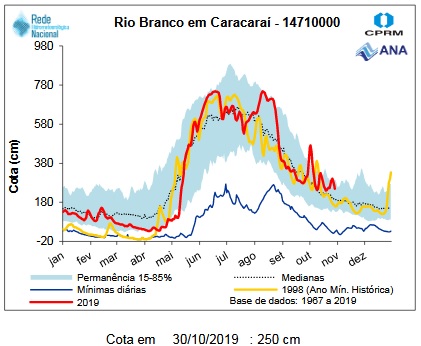 Water level measurements at the Caracarai station (see below) are within the historical parameters . The Omero lakes fishery as well as the Maú river are down river from this station at the Branco basin, water levels are excellent at this time. Please see red circle in stations map above.