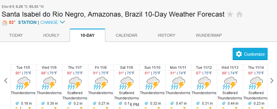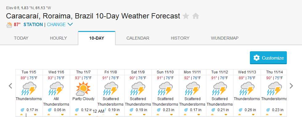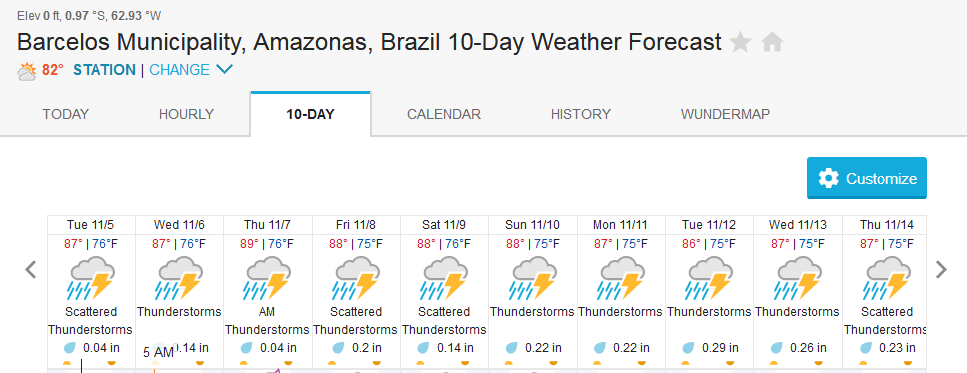 The Maú river in Dry-Zone N. East is dropping and presents good fishing conditions. Rain forecast confirms tendency for the coming days (pls. see below forecast for Caracarai) Water levels in Dry-Zone N.West at our Roçado private fishery have stabilized due to new heavy rain episodes North of the basin, fishing conditions are not good but expected to improve in the coming days. The Omero lakes in Dry-Zone N.East continue to present excellent fishing conditions, weather forecast confirms this (pls. see below forecast for Barcelos) The Upper Jufaris presents a bit high water levels, but dropping and very fishable. Forecast for Caracarai, and Barcelos (see below), further confirm the tendency.