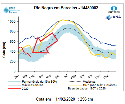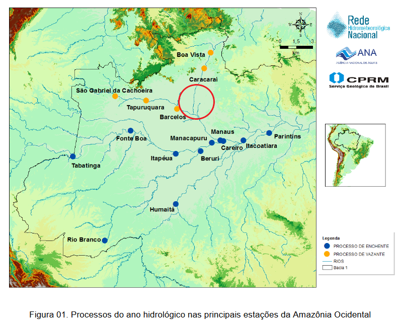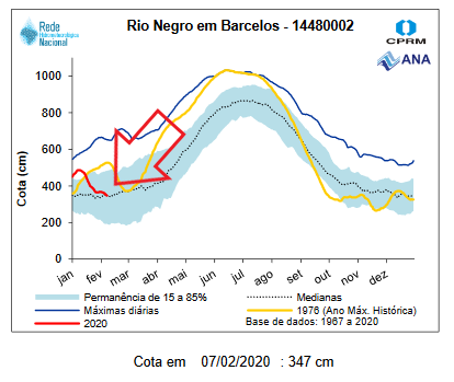 Water level measurements at the Barcelos station (see below) are within the historical parameters, Jufaris river draining into the rio Negro is expected to continue dropping tendency. Please see red circle in stations map above.