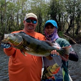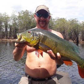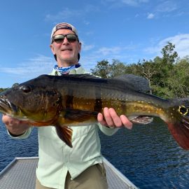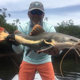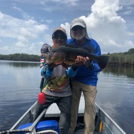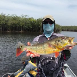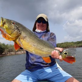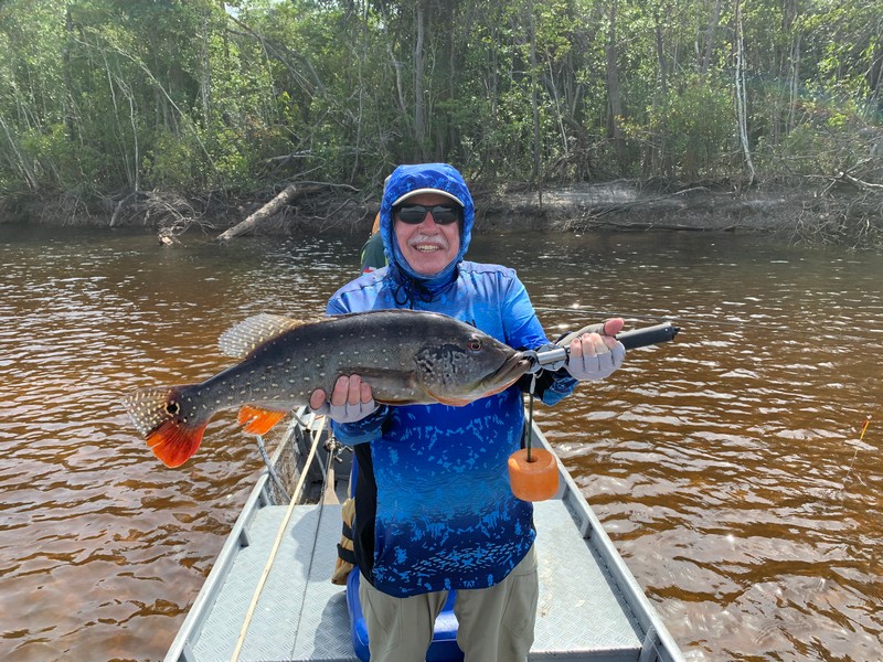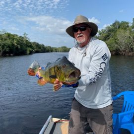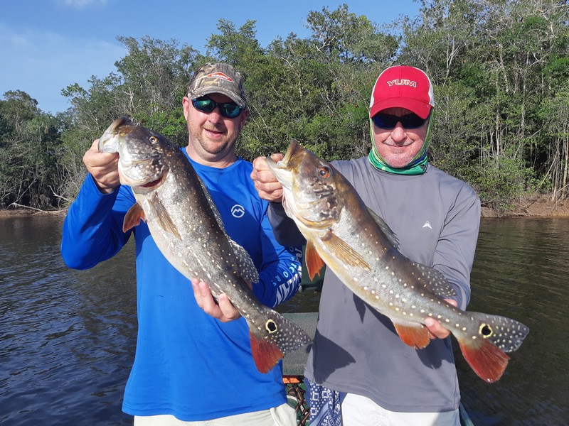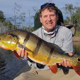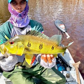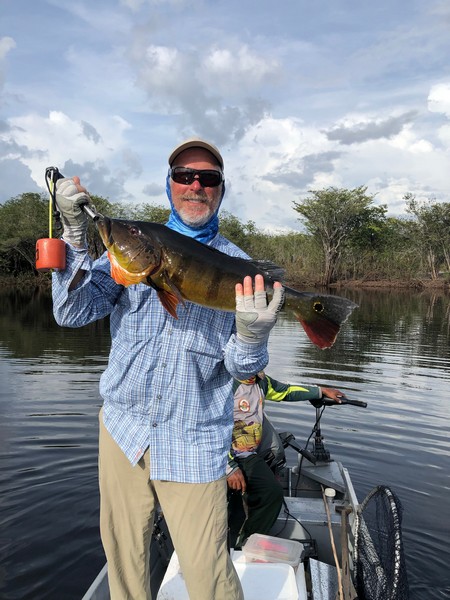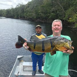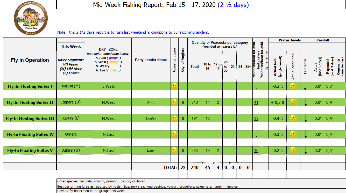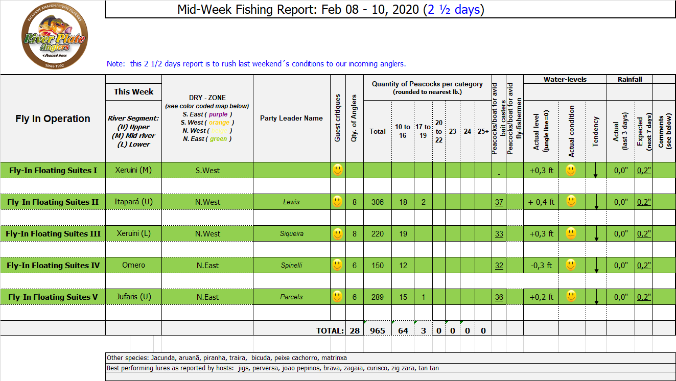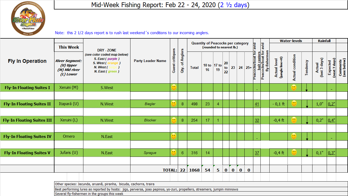 Xeruini in Dry-Zone N. East –: Last weekend we received the Siqueira group of 8 anglers who enjoyed great weather conditions and had a good start landing over 220 peacock bass. River is dropping and fishing conditions are expected to be good in the coming days. Jufaris in Dry-Zone N. East -: The Parcels group of 6 fished in the Upper part of this fishery, exceeding the 200 peacock bass. Excellent fishing conditions during the weekend and forecast for the coming days without any significant rain episodes (pls. see below). Great top water action. Itapará in Dry-Zone N. East -: Last week the Scherzer group had an outstanding performance exceeding the 1000 landed peacock bass, with 18 trophies above the 17lbs. mark., largest weighing 20,5 lbs. . This week we are hosting the Lewis group of 8, including their spouses. They are enjoying perfect fishing conditions and the fantastic jungle experience and wildlife in this secluded and privileged area. Water levels keep dropping, fishing conditions for the coming days are expected to be excellent (pls. see forecast below). Mid water lures are working best for this fishery. Omero in Dry-Zone N. East –: Last weekend we received the Spinelli group of 6 anglers who enjoyed great weather conditions and had a good start landing over 150 peacock bass. River is a bit below the optimum and dropping. Fishing conditions are expected to be good in the coming days in the area.