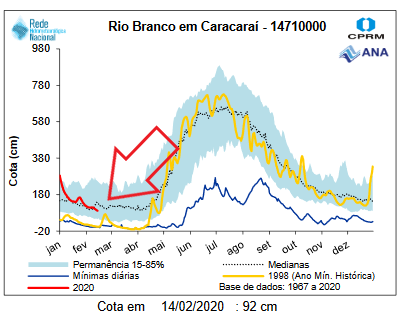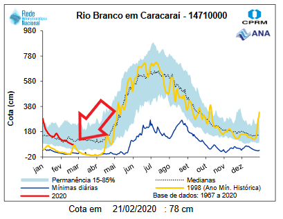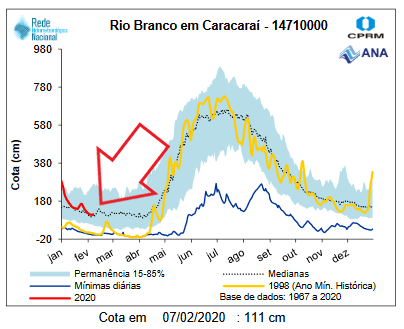 Water level measurements at the Caracarai station (see below) are now within the historical parameters. Please see red circle in stations map above. The Xeruini, Omero and Itapará drain into de Branco river and will keep dropping.