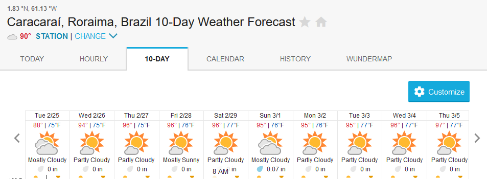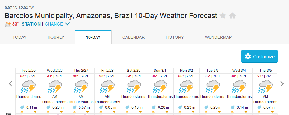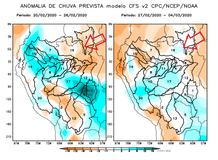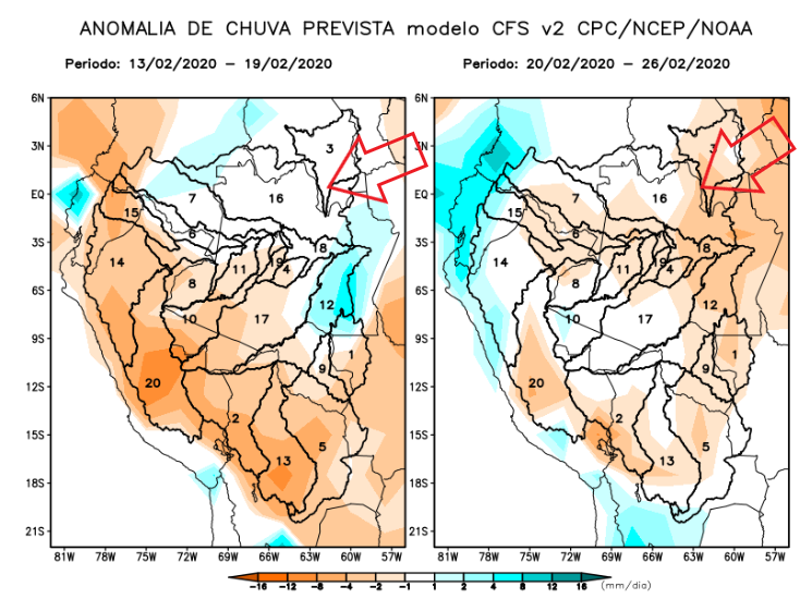 The triangle within Barcelos, Caracaraí and Rorainopolis in the area of influence of our Xeruini, Jufaris and Itapará fisheries forecasts above showing almost no rain episodes in the week.