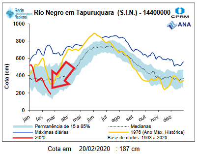 Water level measurements at the Tapuruquara station (Santa Isabel do Rio Negro) are within the historical parameters, Jufaris river draining into the rio Negro is expected to continue dropping tendency. Please see red circle in stations map above.