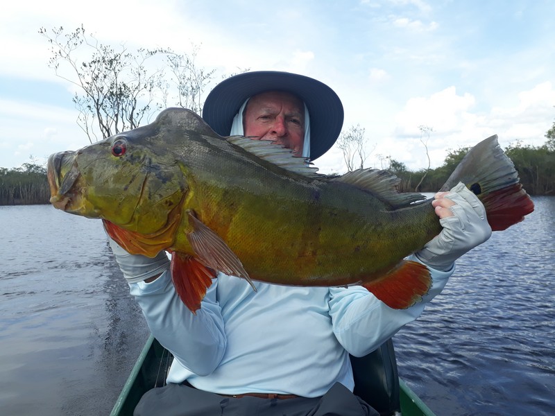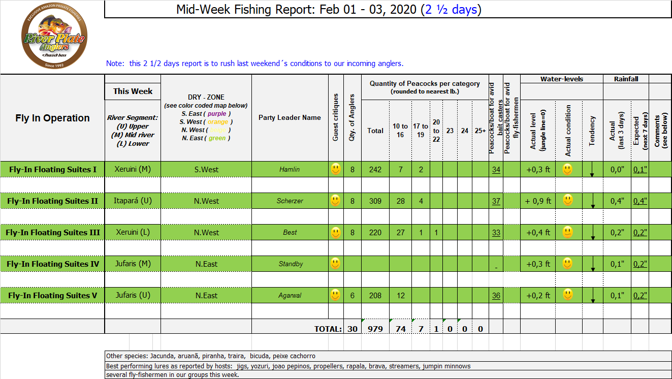 Xeruini in Dry-Zone N. East –: Last weekend two groups ( Hamlin and Best) landed over 450 peacock bass, largest trophy caught and released weighed 22 lbs. Water levels are almost at jungle level and weather has been perfect and fishing conditions are expected to continue during the rest of the week (pls. see below). Several fly-fishermen in these groups. Jufaris in Dry-Zone N. East -: The Agarwal group of 6 fished in the Upper part of this fishery, with an excellent size mix within a basket exceeding the 200 peacock bass. Excellent fishing conditions during the weekend and forecast for the coming days without any significant rain episodes (pls. see below). Great top water action. Itapará in Dry-Zone N. East -: Host reports 2 trophies above the 19lbs. and tally exceeding the 300 landed peacock bass mark. Water levels are almost at their optimum and dropping, fishing conditions for the coming days are expected to be excellent (pls. see forecast below). Mid water lures are working best for this fishery.