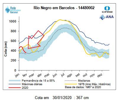 Water level measurements at the Barcelos station (see below) are within the historical parameters, Jufaris river draining into the rio Negro is expected to continue dropping tendency. Please see red circle in stations map above.