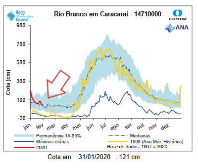 Water level measurements at the Caracarai station (see below) are now within the historical parameters. Please see red circle in stations map above. The Xeruini and Itapará drain into de Branco river and will keep dropping.