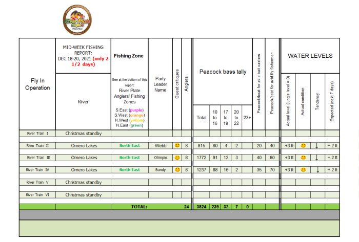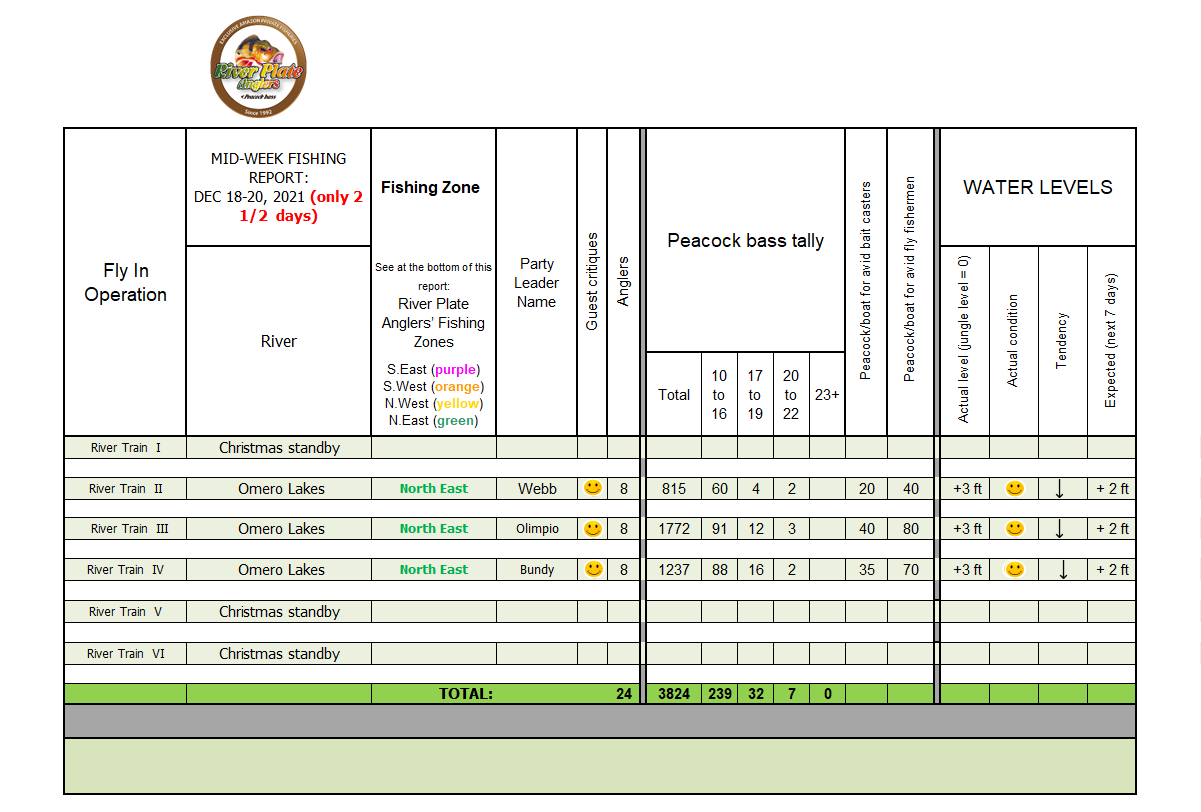 Stats: The last 24 anglers for the year caught in 6 ½ days 3,834 peacocks with 239 peacocks between 10 and 16 lbs.; 32 between 17 and 19 lbs.; and 7 between 20 and 22 lbs.( see the above chart)