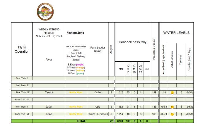Weather: we had a mix of sunny skies and cloud cover. A couple of rainstorms poured, which at this time are necessary to bring the water temperature slightly down and benefit Peacocks. Our North West Zone forecasts roughly the same weather for next week