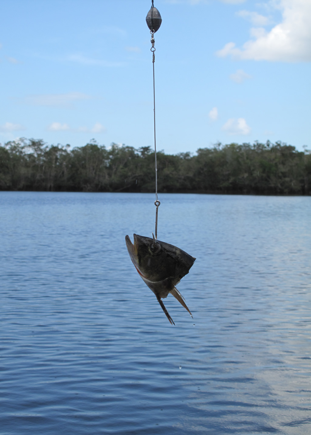 Here´s the thing: Normally areas where giant catfish dwell (e.g. redtails, piraras, etc.), like this fork, are deep and present lots of activity, among which there is a thick layer of piranhas not far from the surface. This simple fact implies that nothing eatable will pass this layer unless it is hard enough to endure the relentless attack of these voracious creatures. Guess what, the only available bait capable of doing the trick is the head of the noble dogfish.