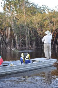 Novice peacock anglers tend to set the hook too fast when fishing top water lures or flies. Often peacocks will just slap at the lure to stunt it and then come back around and firmly grab it on the second pass. It’s hard to remember at first, but don’t set the hook on the strike. If you can’t see the plug or fly after about three seconds, drop your rod tip and set the hook as hard as you can. Big peacocks have very tough skin around their mouths and tend to grip the plug or fly firmly.