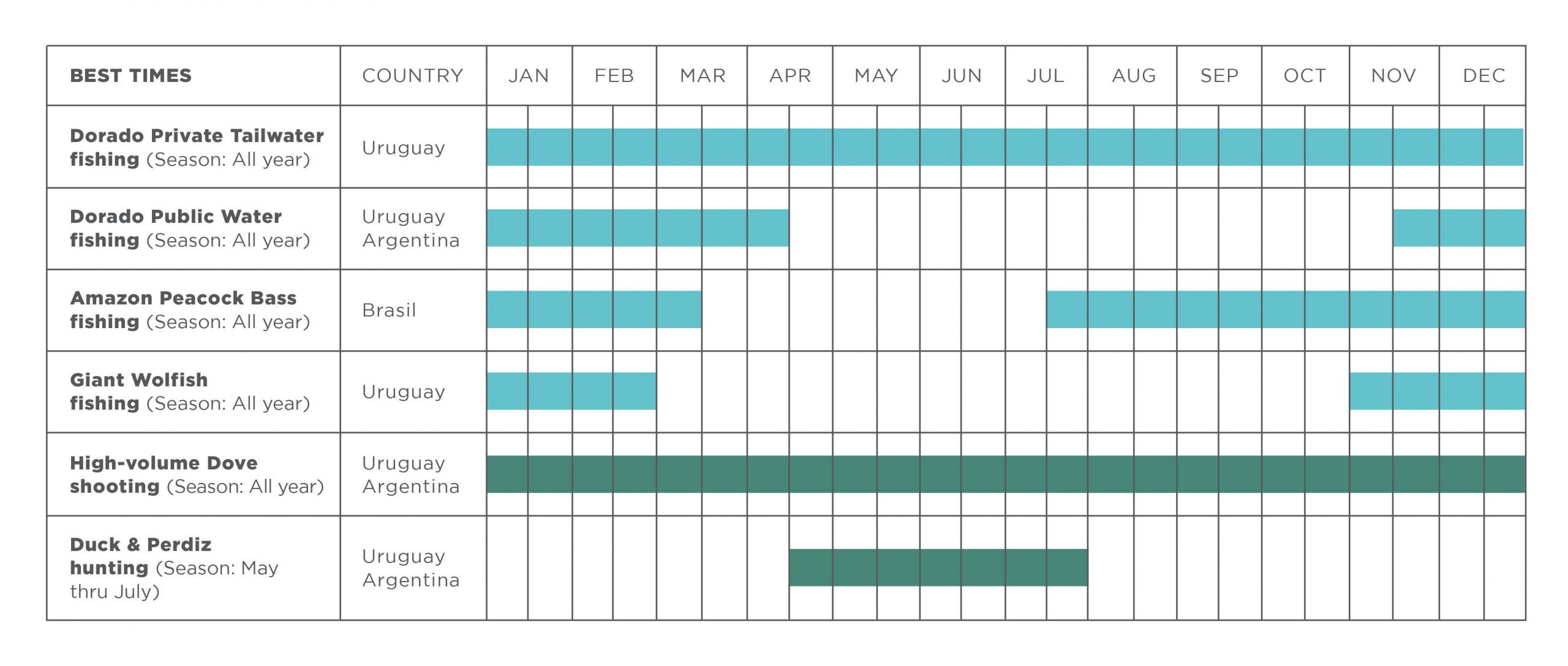 May thru October: These are our colder winter months, coinciding with the spawning season. At this time of year, you will likely land larger trophies but fewer fish overall. The early to mid part of this period is a good time to combine your dorado fishing with duck, dove, and perdiz shooting at one of our estancias on the way to or from your international arrival city, namely, Buenos Aires or Montevideo.